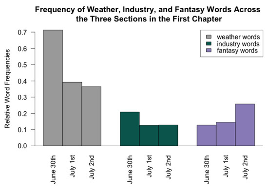 The presence of weather words, industry words, and fantasy words across the three sections of the first chapter (June 30th, July 1st, and July 2nd). The structure of the entire chapter mirrors the structure of the excerpts I have looked at in detail. Weather and industry words occur more frequently in the first section of the chapter than in later sections, while fantasy words figure more and more prominently as weather and industry word frequencies taper off. Climate and its causes are initially made present only to be superseded by a fantasy plot. For the words counted in each figure, see Appendix A.