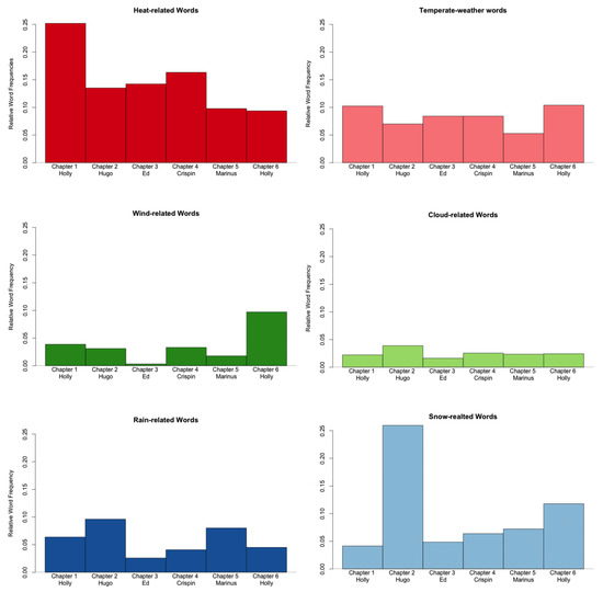 A comparison of the relative frequency of words associated with different types of weather across the six chapters in The Bone Clocks. The first and last graphs show that Chapter 1 is the hottest chapter, while Chapter 2 is the snowiest chapter respectively. The third graph shows that wind will make an appearance in the final chapter. While weather is present throughout the novel, heat and snow comprise the most extreme weather events. The temperate weather, clouds, and rain are less memorable. The final chapter turns wind into another example of extreme weather due to possible windborne radiation.