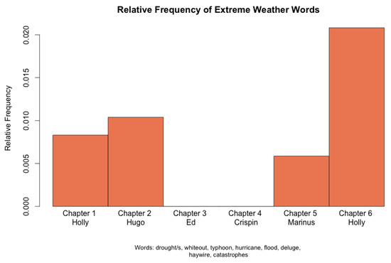 The relative frequency of extreme weather words in the text. Extreme weather features in the first two chapters, then is absent from the middle of the book, has a slight presence in the penultimate chapter, and comes back aggressively in the sixth and final chapter, which reveals that weather is what we should have been paying attention to throughout.