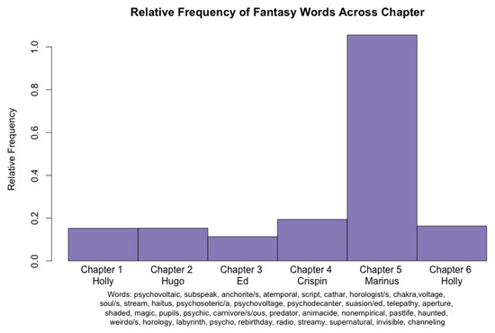 The relative frequency of words associated with the fantasy subplot. The fantasy slowly builds in each of the chapters until the penultimate one then drops off again suddenly in the final chapter when climate makes its comeback.