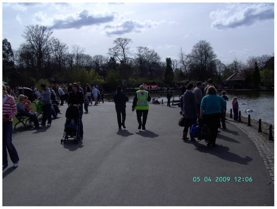 On one occasion (March 22), I found that I was being tracked by a CCTV security camera near the Bowling Greens, one of the several to be installed in the park with restoration. I tested whether this was a deliberate tracking by resorting to an impromptu side-step dance. The camera followed me. It struck me that that the cameras did not always seem to track movement within the park; I watched their movements when I was in the park both before and after, and they rarely moved. This was the only occasion when I observed anyone within the park being tracked. Was this something for me to be concerned about? After all, the experiences of ethnic minorities in public parks have been often seen as problematic (Abercrombie et al. 2008; Gobster 2002; Byrne 2011; Byrne and Wolch 2009). Speaking to one of the wardens had previously informed me that the cameras were controlled off-site.