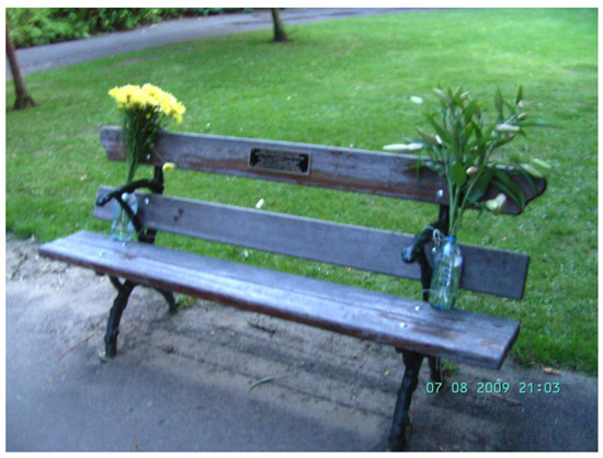 The park affords dwelling to various community groups and individuals to appropriate spaces to mark their personal interactions and attachments. Within the first floor of the Towers, a glass cabinet holds the trophies that local Bowls’ clubs have won over several decades. More widely, Saltwell Park serves as a significant communal space of remembrance for the town of Gateshead. There are memorials, plaques, and statues, to significant local figures. There is a mixture of civic tributes to both civilians and military service personnel. Many more informal, private, plaques have also been installed on most of the many benches located along the footpath network, some of which also record the names of armed service personnel, plus others who had not obviously been in uniform (see Figure 7). For example, one seating bench carried a dedication to one “Tommy Sergison”, whose commission into the Durham Light Infantry during the Second World War, as well as his marriage to the late Viola, were remembered with a metal plaque. A bunch of flowers would often appear, tied to the side of the bench, to the arm-rest, at various times of the year, not only associated with major military anniversaries (such as the UK’s Remembrance Day, November 11).