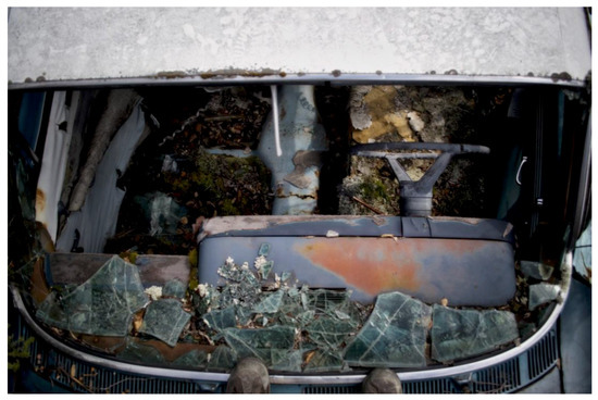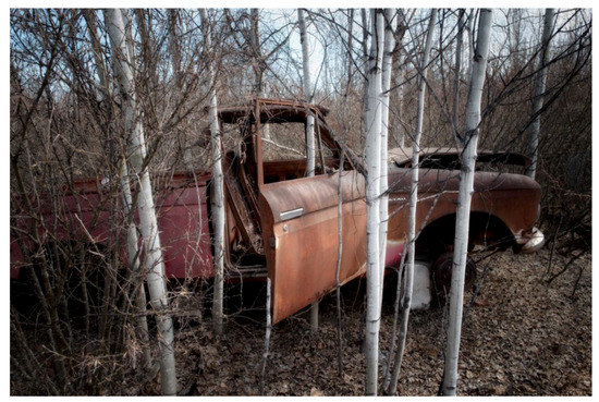 Our exploration of Uranium City took five full days (3–8 May 2017) and what we experienced during those days seemed to contradict, powerfully at times, Ty Lloyd’s position, fueling our evening discussions about abandonment. Each day we employed an array of digital and film cameras as well as a drone, documenting each street from the ground and air (Figure 9). We photographed suburban neighborhoods that hadn’t been lived in for thirty-five years, while a few others closer to the center contained intact homes with human occupants. We saw reforested yards, picket and wire fences, sidewalks, playgrounds, and parks—in short, the spaces commonly found in cities occupied by humans. We documented infrastructure as well: basements, manholes, foundations, water lines, fire hydrants protruding still in seemingly absurd places, and a nearby adit, a private horizontal mine shaft installed long ago by a prospector. We visited institutional sites of gathering, dispersal, burial, and disposal: the sealed Roman Catholic church, the well-kept cemetery, the Canadian Legion Hall, the Uranium City landfill, and the vandalized Candu High School. Someone directed us to an automobile junk yard containing not just dozens of vehicles but also a small fleet of city buses, all locked into the space and time of this region—accessible on the ground only in winter on the ice-road traversing Lake Athabasca west to Fond du Lac—and all now well-forested. When we noticed a mature tree growing between an abandoned Datsun truck cab and its open passenger door, we knew a long time had passed (Figure 10). As we documented such instances repeatedly, we also noticed our own fatigue and creeping desensitization. We took frequent rests, during which we discussed the concept of abandonment as well as our immediate responses to the many scenes we were encountering.