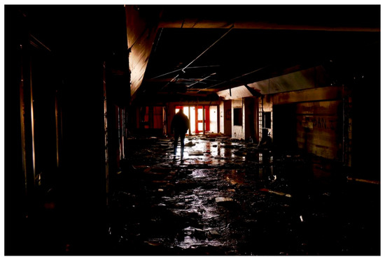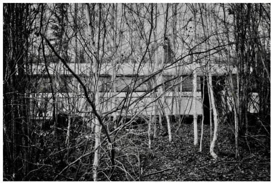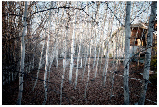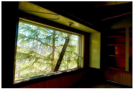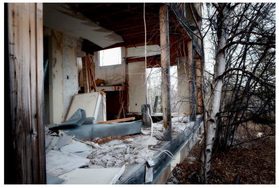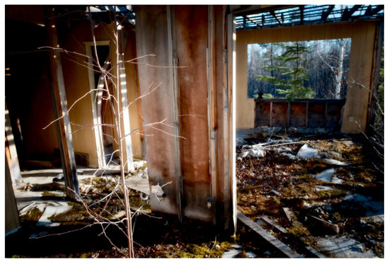 We observed that the trees that have now grown into the abandoned neighborhoods of Uranium City—through the infrastructure and sometimes right through the houses themselves—have something to say (Figure 18). Consultation with all manner of trees in Uranium City could have wide-ranging effects connected to life, hope, and creative planning for present and future human communities. Porousness could be increasingly recognized and embraced within current architecture and planning practices; not that humans in the twenty-first century would permit porousness but rather acknowledge more fully the reality of the porous relationship with the rest of nature (Figure 19). Rather than merely well-treed cities, we could move toward forest cities where vulnerability and relation are made more explicit. Rather than the stock ambivalence toward poplars based on fear of their root systems, as is the case in our home city of Calgary (City of Calgary 2017), perhaps building practices could adapt to new models along the lines of Tim Ingold’s description of what a human already is: “the whole-organism-in-its-environment” (Ingold 2000, p. 759). Cairns and Jacobs’ concept of “architectural agency” would also be involved, in what they call “a less defensive relationship between architectural creative action and death” (Cairns and Jacobs 2014, pp. 231–32). Another tree expert, David George Haskell, comments: “Because life is network, there is no ‘nature’ or ‘environment’, separate and apart from humans. We are part of the community of life, composed of relationships with ‘others’, so the human/nature duality that lives near the heart of many philosophies is, from a biological perspective, illusory” (Haskell 2017). Finally, and most important, Indigenous peoples with their traditional environmental knowledge (TEK) require genuine, actionable acknowledgement.