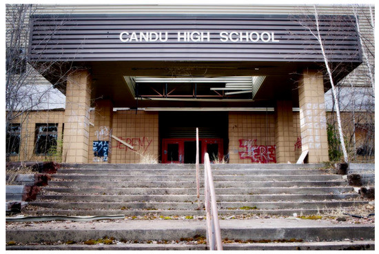 Mayor Dean Classen, who has lived in Uranium City all his life, says of its abandonment that “it doesn’t bother me anymore, but it used to” (Classen 2017, Personal Communication). It has taken him decades to process the mass exodus he witnessed in his youth, while continuing to live there and manage the remaining community’s vital functions. In addition to pursuing his administrative duties as mayor, Classen looks after bulk fuel, banking, satellite communications, transportation, infrastructure maintenance, and airport security, among other things. Mayor Classen does all this, in effect, as a lifelong response to decisions made by others in the past. He was preparing to graduate from the then new Candu High School (Figure 6) when the president of Eldorado Mines Corporation, Mr. N. Edigar, suddenly announced the closure of operations on 3 December 1981 (McIntyre 1993, p. 315). The largest mine, Beaverlodge, had been running continually for thirty years. The people who directed Eldorado had recently purchased a new Boeing 737 airliner, built new housing and other facilities, and improved the mine, spending over $100 million CAD in the year before the closure announcement (ibid., p. 315). Given such expenditures as well as the Crown Corporation’s other indicators that business would continue into the future, the community of approximately 4000 then living in Uranium City could not have seen what was coming. Eldorado’s commitment to infrastructure in the form of such substantial capital outlays belied its own announcement and was therefore met with disbelief. The then brand new Candu High School itself was a testament to the announcement’s incredibility. Yet the 1982–83 academic year would be the last for this state-of-the-art education facility. Candu High School, named after Canada’s unique heavy-water nuclear reactor sold to countries such as India (Sandberg 2016, p. 28; Candu Owners Group, Inc. 2016), would soon serve as one of the central figures in Uranium City’s subsequent history (Figure 7).