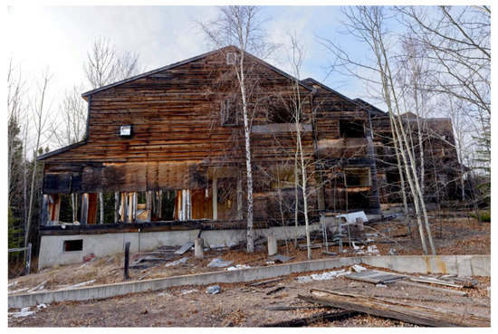 Patrick Deranger’s story regarding the dislocations and betrayals he and his family experienced arising from the establishment of Uranium City in the early 1950s points to the reality of abandonment in its own temporal frames. There is not a single abandonment but many abandonments that occur when economy and cultures, each comprised of human agents, interact. Non-Indigenous peoples, often in family units, came from around the world to work in Uranium City (McIntyre 1993, pp. 58–64, 65; Sandberg 2016, pp. 51–76). Eldorado Corporation, on behalf of the Government of Canada, moved families from Ireland and Germany, especially during the initial years of the Beaverlodge operation (McCaffery 2017; Melzer 2017). The children of these and other immigrants grew up in Uranium City; their parents bought homes and took out mortgages, built cottages, and grew to love and become immersed in the region’s unique landscape (Figure 12), with its red and pink rock dominating the hills of the northern shore of Lake Athabasca. From the air, one can see extensive deserts of white sand along the southern shore, where ancient Indigenous hunting implements have been discovered (Mackie 2017, Personal Communication). According to Patricia Sandberg, “More than fifty companies were reported to be working in the Beaverlodge area in 1954, and Uranium City was the hub” (ibid., p. 28). Nearly thirty years later, when Eldorado, the largest and most powerful company, decided to call it quits, thousands of people were forced to leave despite desperate efforts by community leaders to create new plans for Uranium City’s economic survival (McIntyre 1993, pp. 314–23). Many walked away from properties they owned and cherished and on which they held mortgages (Mercredi 2017). “People were really hurt, especially homeowners” (Classen 2017). No compensation was offered (Mercredi 2017; Classen 2017; Melzer 2017). A large condominium and apartment block complex was completed in the early 1980s and never occupied, standing to this day as a testament to the complexities of abandonment that cyclonic development as a metaphor cannot adequately represent (Figure 13). The construction company contracted to this project fulfilled its obligations in order to be paid, knowing, along with everyone else, that it would never be lived in (Mercredi 2017). Today former and current residents of Uranium City still feel misled by the infrastructure and investment that preceded and even extended beyond the closure announcement by Eldorado Mines on 3 December 1981 (Classen 2017).