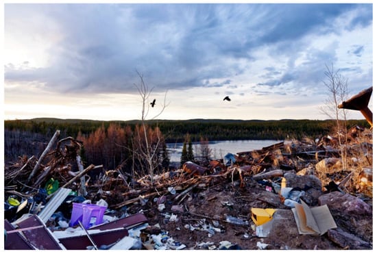 The town landfill, finally, continues to be used even though it dates from the mid-twentieth century and is therefore built on technologies from a previous era (Figure 16). We agree with Ken Mercredi’s opinion that the landfill contents should never be moved, and laud his efforts to identify water outlets in the immediate vicinity of the landfill site bordering on Frank Lake (Mercredi 2017, Personal Communication). We also accept his opinion that runoff is contained to Frank Lake. At the same time, the two dominant narratives of garbage, as Lindner and Meissner write in their introduction to Global Garbage: Urban Imaginaries of Waste, Excess, and Abandonment (Lindner and Meissner 2016), are also on our minds: “the narrative of garbage as relational (as an entity relative to something within a socio-symbolic system) and the narrative of garbage as revenant (as refuse that refuses to be disposed of)” (ibid., p. 395). Both narratives apply to Uranium City and both support our argument that cyclonic development as a term requires reexamination. Moreover, we do not think it equitable that community citizens, however knowledgeable, should bear the burden by themselves of monitoring the consequences of decisions taken by others decades ago. Without residents such as Ken Mercredi, Allen Augier, the Classens, and others, all of whom are in their fifties and sixties, who will undertake voluntarily to monitor the Uranium City landfill as well as other sites of concern in Uranium City itself?