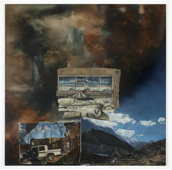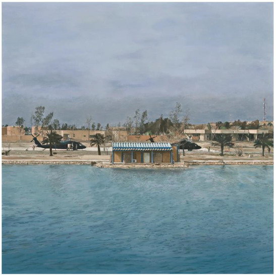 Their response to their period in and around the ‘front’ line was a suite of contemplative, realist paintings and, by contrast, painterly photographs of the paraphernalia and infrastructure of a nebulous new warfare—huge bases, hardware technologies, fleets of armoured vehicles, soldiers preparing for patrol. In one painting a troupe of American drone pilots high in the Afghan mountains proudly showed off their weird craft; in another a squadron of attack helicopters is neatly parked inside a huge compound, immortalized in The Dark Palace 1, 2011 (Figure 4). At the intersection of landscape, culture, and technology, these gravely quiet, almost frozen fragments of conflict were, as the artists noted, ‘a portrait of force, of the hard edge of globalisation’ (Brown and Green 2008).