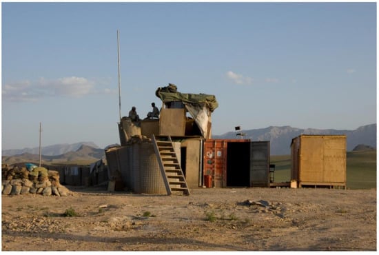 Several painters, most famously Paul Nash, adopted and extended Farrer’s reading of the new face of war, and posited the notion of a ‘Void of War’ as a means of re-determining the inverted spatiality of the modern battlefield. Nash and others embraced this spatial inversion: populating its emptiness with latent violence, marveling at its awesome potency, and depicting it as a place haunted by sublime qualities. (Gough 2017) As Brown and Green had seen in Iraq, the militarised terrain is not so much a landscape as the same, uncanny ‘paradox of measurable nothingness’ of World War 1 (Weir 2007, p. 43). ‘Our aim’, they have written, ‘was an apparent neutrality and objectivity as the means for creating a powerful vision of overall clarity and focus (but not necessarily the truth) in the midst of chaotic ruination’ (Green et al. 2015, p. 170). This aim is manifest in very recent collaborative paintings such as Spook Country (Maliana) (Figure 5). In contrast, Afghan National Army Perimeter Post with Chair, Tarin Kowt, Uruzgan Province, Afghanistan, 2007–2008 (Figure 6), shows a guard post at the edge of an enormous base in the mountains of southern Afghanistan. The photograph was taken in late afternoon with raking, warm light throwing the scene into sharp focus. But the view is one of highly composed decay and entropy: a guard post made of old shipping containers; broken office chairs like sculptures atop the containers; jagged blue mountains from which the Taliban probe the base’s edges; a war zone out of control that was to revert to Taliban control the moment that Western troops evacuated a few years afterwards.