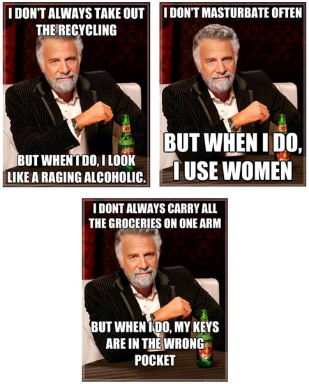 The success of the joke is predicated on individuals recognizing not only the Most Interesting Man in the World character but also the constructs of the Dos Equis commercials themselves.23 The X-Y formula keys the interactive humor frame and points to multiple existence and variation of the source materials. This also falls under the umbrella of what Michael Dylan Foster calls the folkloresque or “popular culture’s own (emic) perception and performance of folklore” (Foster 2015, p. 5), another area in need of deeper folkloristic inquiry.24