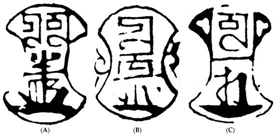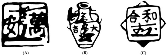(A) A Song Yuan Huaya with Chinese characters “Wanan” and an ethnic element. The period of the Song and Yuan Dynasties. Sketched by author. Picture source: Shi (1995), p. 60. (B) A Song Yuan Huaya with Chinese characters “Daji 大吉” and an ethnic element. The period of the Song and Yuan dynasties. Inventory number: 1873. Sketched by author. Picture source: Wen (1995), p. 436. The original collection: Qingqing, Wu. Shiliu Jinfu Zhai Yin Cun [《十六金符齋印存》]. Book of impressions. The Fourteenth year of Guangxu, the Qing dynasty. (C) A Song Yuan Huaya with Chinese characters “Hehe 和合” and an ethnic element. The period of the Song and Yuan Dynasties. Inventory number: 1684. Sketched by author. Picture source: Wen (1995), p. 402.