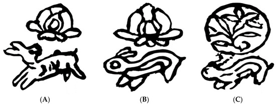 (A) A Song Yuan Huaya with a Hare motif and a “Shoutao 壽桃 (the Longevity Peach)” lotus. The period of the Song and Yuan Dynasties. Inventory number: 0694. Sketched by author. Picture source: Wen (1995), p. 199. (B) A Song Yuan Huaya with a Hare motif and a stylistic lotus. The period of the Song and Yuan Dynasties. Inventory number: 0693. Sketched by author. Picture source: Wen (1995), p. 199. (C) A Song Yuan Huaya with a Hare motif and a floral motif. The period of the Song and Yuan Dynasties. Inventory number: 0704. Sketched by author. Picture source: Wen (1995), p. 201. The original collection: Zhuang, Sun. Xue Yuan Cang Yin [《雪園藏印》]. Book of impressions.