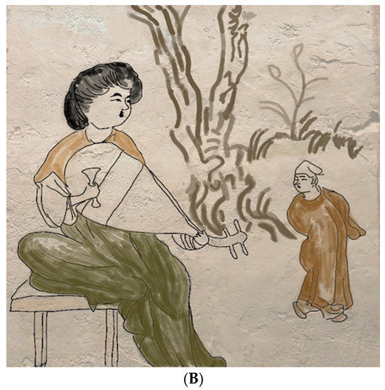 (A) Part of a mural painting of Kizil Grotto with a depiction of the Hu Pipa, chamber no. 38. The middle of fourth century to the end of fifth century, CE. Sketched by author. Picture source: Zhao (2003), p. 40. (B) Part of a mural painting of the tomb Nanliwang 南里王 village with a depiction of Hu Pipa. The Tang Dynasty. Sketched by author. Picture source: Shaanxi History Museum.