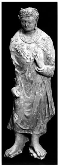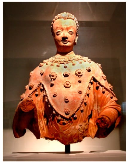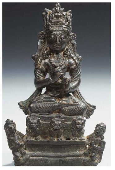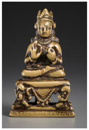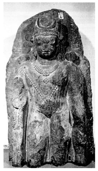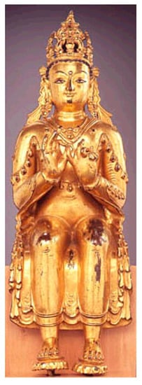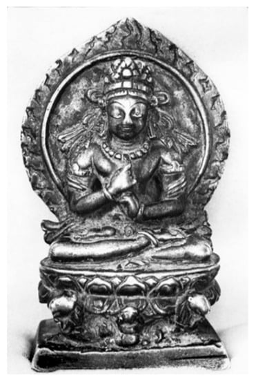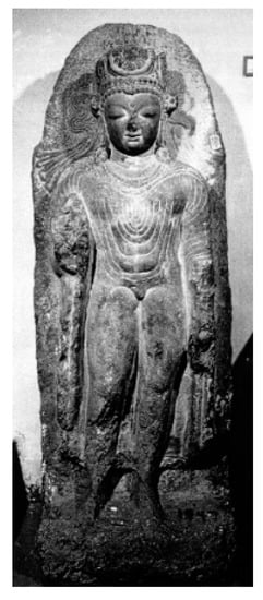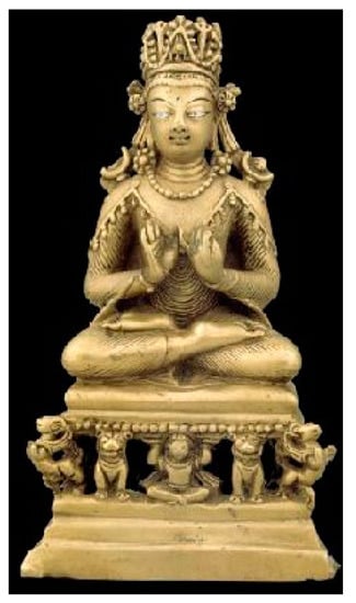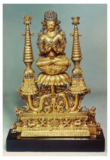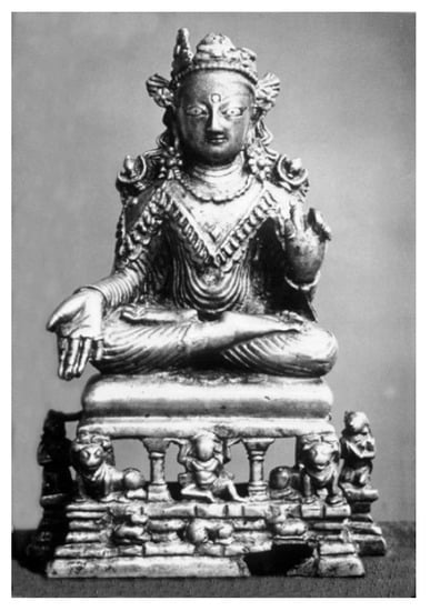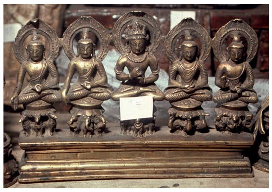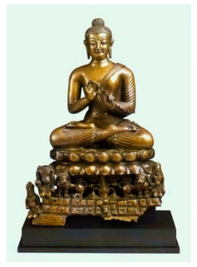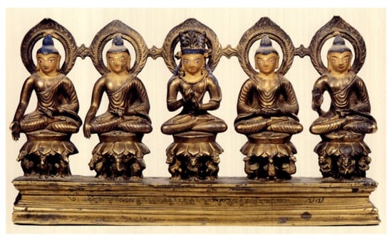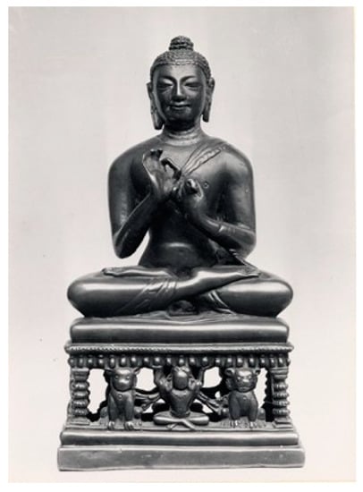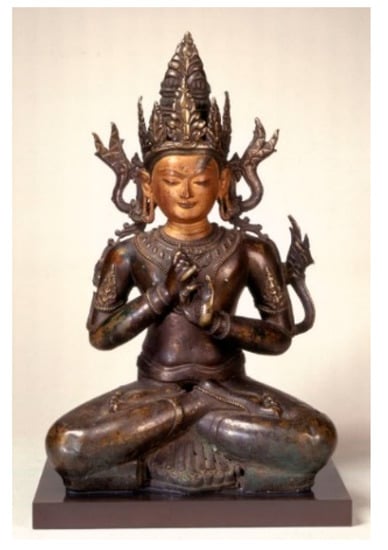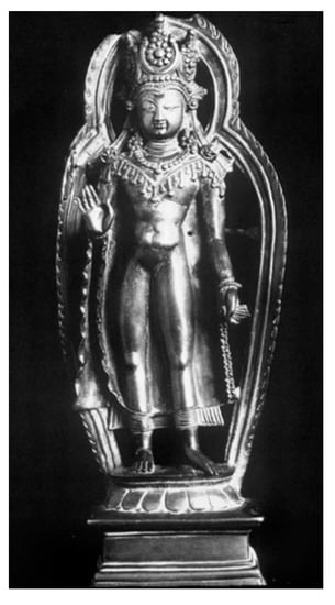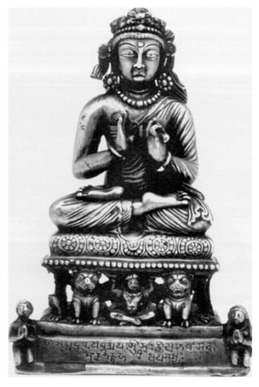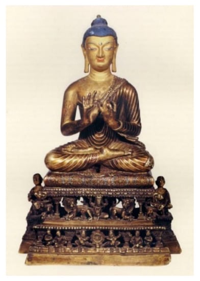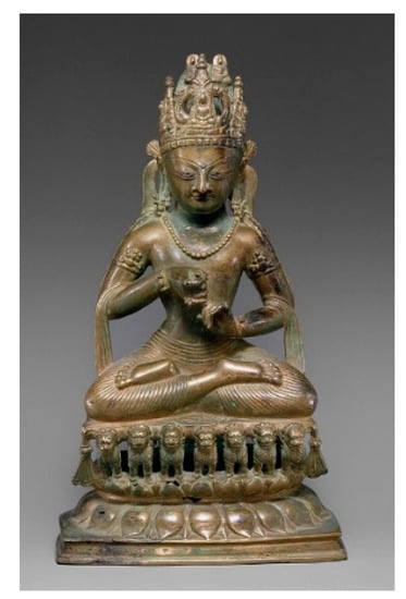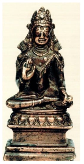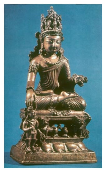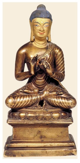 | 7 | For an additional example, see the Buddha wearing a crown and cape with crescent moon and sun symbols that was commissioned by the monk Bhadradharma and his parents, 679/680 C.E. Gilgit. Brass with silver inlay. 20.5 cm H × 20.2 cm W. Po ta la Collection: Sa gsum lha khang: inventory no. 82. Red Palace, Lhasa, Tibet, in Ulrich von Schroeder (2001, pl. 22). |