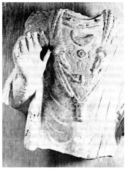 The symbols of the crescent moon with a rosette-like sun are also recurring iconographic elements on crowned Buddha figures from the Silk Road. Sometimes, these symbols are depicted within the crown and/or on the shoulders of the Buddha; hence, they can be considered a form of jeweled ornament. Several crowned Buddha figures from Kashmir that were mentioned earlier feature crowns that carry the motifs of the crescent moon with a rosette-like sun inside of it (see Figure 7, Figure 8, Figure 13 and Figure 16). Note that two of the four Buddhas also feature the elaborate cape, and that Figure 16 also bears the same symbolic motif on the shoulders.