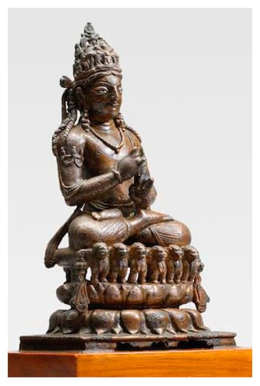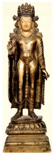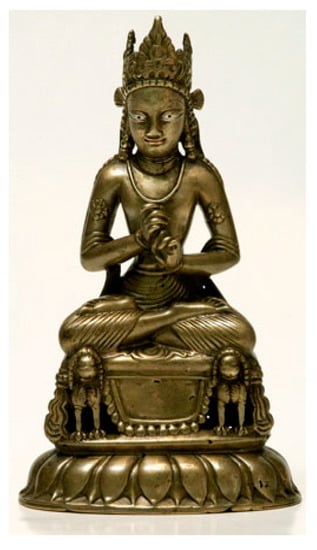 Buddha wearing a crown and jeweled cape, ninth c. Kashmir or Northern India. Bronze. Alan Robert Naftalis Collection. https://www.himalayanart.org/items/86315/images/primary#-1710,-2380,3009,-1. Copyright@ 2018 Himalayan Art Resources Inc.