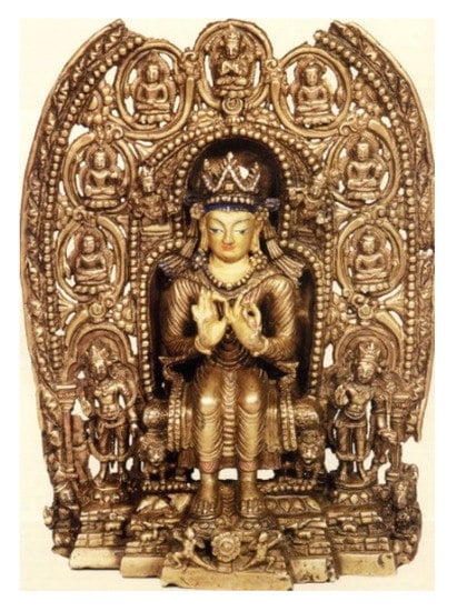 Moreover, when a crown on a Buddha has five points or triangular sections or five jewels around the diadem, it especially represents the five insights of the pañca jina Buddhas, and is therefore called a pañca jina crown (Figure 21). The crown can also depict each of the five Buddhas as well. The pañca jina crown is an esoteric symbol of the five transcendent qualities and five Buddhas that constitute the totality of enlightenment or Buddhahood (Huntington and Huntington 1990; Livingston 2003; Huntington and Bangdel 2003).16 Thus, both the pañca jina Buddhas and the crown are a paradigm for Vajrayāna symbology, practice, and attainment.