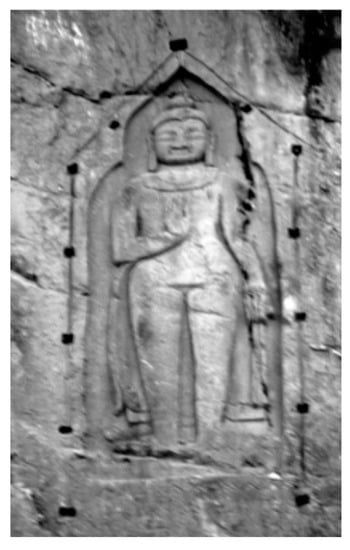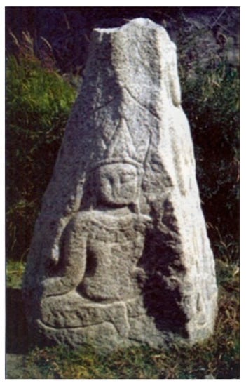 Similar lunar and solar symbolism appears on quite a few of the crowns on the Paṭola Śāhi Buddhas. More importantly, a crescent moon with a sun inside is found on all of the shoulders of their crowned Buddhas wearing capes (see Figure 5, Figure 6 and Figure 19). Interestingly, the symbols also appear on the top of the stūpas that flank the Buddha in one sculpture (Figure 6). These are not the only examples of this iconography along the Silk Road. The crescent moon with a solar disc is also depicted on several stūpas found in rock carvings in Chilas and one from Thalpan.
