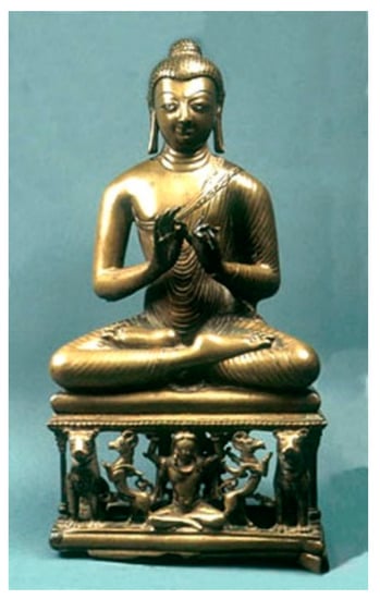 | 33 | Without a complete understanding of the iconography, von Schroeder suggested that when Śākyamuni made the mudrā, it represented the First Sermon, but on other images, it just represented the wheel of the dharma, 118. For a further discussion on the meaning of a mudrā, see (Beer 1999, pp. 149–50). |