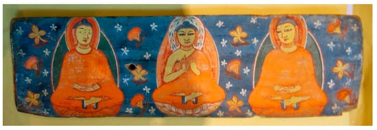 | 12 | Evidence of this can even be seen on some of these artworks. For example, both the Paṭola Śāhi king and queen donors of the Buddha in Figure 5 have crescent moons with a solar symbol inside of it decorating their crowns. Moreover, Klimburg-Salter (1989) pointed out examples at Bamiyan and Fondukistan with other variations of the heavenly symbols incorporated into the decoration of the crowns used for kings. It is possible that these motifs also derive from the Sassanians, such as the silk ribbons on the crown. |
