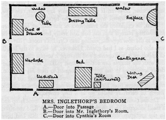 As the story unfolds and Hercule Poirot, who happens to live in the village of Styles St. Mary as a Belgian refugee, is given the task of solving the intricate mystery, Captain Hastings draws an additional map, this time focusing on the detailed representation of the interior space of Mrs. Inglethorp’s bedroom, the scene of the crime (Figure 2). The map is provided, in this case, at the beginning of Poirot’s investigation.