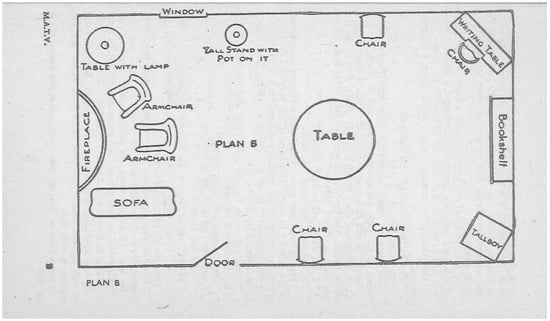 Figure 4 captures the layout of the vicar’s study. It is provided with a fireplace, as Roger Ackroyd’s study and it is located away from the busiest rooms of the house. The study is readily accessible to anyone. Hence, when Colonel Protheroe—one of the wealthiest men in St Mary Mead—arrives at the vicarage and the vicar is not in, the maid invites him to take a seat in the study (Christie 1997, p. 533). Having in mind to write a note, he places himself at the writing table, on the right side of the bookshelf, where he will meet his death. The homicide inevitably links together the two most notorious households of the village: that of the vicar Leonard Clement, who also serves as the first-person narrator of the events, and the country house of Old Hall, home to wealthy Colonel Protheroe, his second wife Anne and his daughter Lettice. Whereas at the Vicarage life is characterized by a vivid domesticity, life at the Hall is static and unhappy. The Colonel’s murder is planned in every minimum detail, where time and place/space mingle together. Its solution will be the result of the enigma of the vicar’s clock kept a quarter of an hour ahead and of the movements of the characters within the community space.