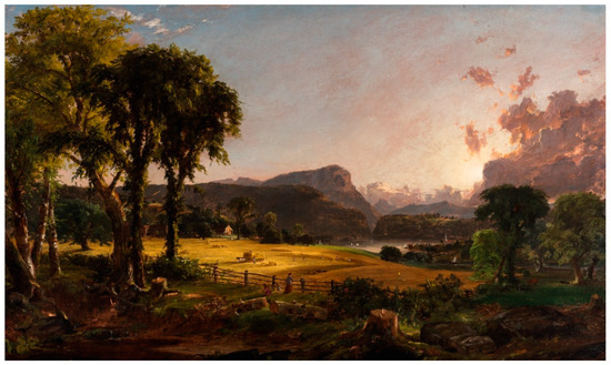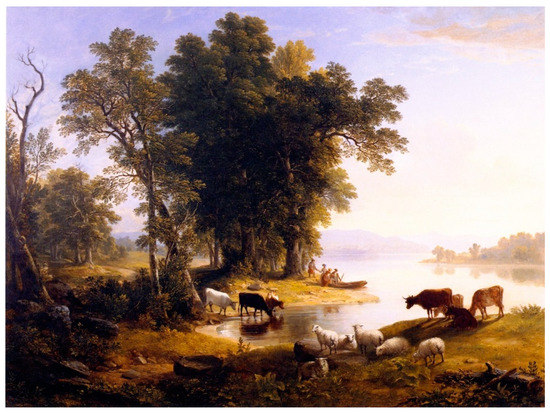 The moral and social tone of the pastoral and the values projected in it are evident in many other paintings during the nineteenth century as well. Asher B. Durand’s The Hudson River Looking Toward the Catskills (1847) (Figure 1) and Jasper Cropsey’s American Harvesting (1851) (Figure 2) are a few examples of paintings that represent America as a peaceful, pastoral paradise. In paintings such as these, the landscape has a park-like appearance, in which green meadows are interspersed with groves of trees, suggesting the art of humankind in conjunction with nature. Cows graze in fields or drink at peaceful water, while humankind lives harmoniously in the natural world. Nature itself is non-threatening and inviting. It is domesticated rather than sublime. As Angela Miller notes, nature is “socially and aesthetically accessible to genteel Americans” (Miller 1989, pp. 122–23). Similarly, in Durand’s The Hudson River Looking toward the Catskills (Figure 1), contented cows and sheep graze nearby while picnickers enjoy nature under the trees (Burns 1989, p. 16). In each of these paintings, there is a perfect balance between the work of humankind and the wildness of nature.