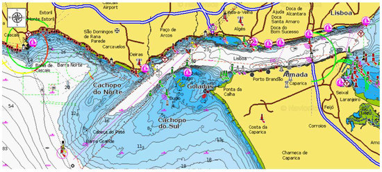 Current cartographic representation of the Tagus estuary (Lisbon, Portugal), showing the ‘Cachopo’ sand banks, the Bugio permanent sand bank as well as the ‘Golada’ channel. Source: www.navionics.com.