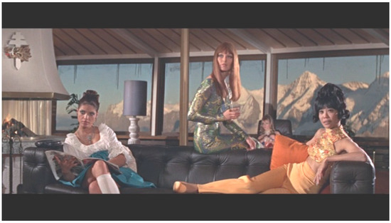 The film version, by contrast, does not go for the satirical and over-the-top image of peasant girls with “splendid, sweatered young bosoms” (Fleming [1963] 2015, p. 397), whose hair “smells of new-mown summer grass” (p. 443) and who are brainwashed into poisoning the countryside. Instead, the viewer is treated to a gallery of international starlets who are framed through the male gaze, not so much a celebration of female diversity among the nation than a concession to contemporary Playboy aesthetics (Figure 1); to show that he is ‘with the times,’ Bond even reads a copy of Playboy in another scene.