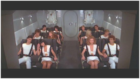 As Bond sneaks upon the ark that carries the progenitors of Drax’s future master race, all of whom are clad in white garments, the ethnic diversity amongst the genetic elite appears no less committed to hegemonic whiteness than Bond’s own, 19th-century informed vision of colonial imperialism (Figure 3). There are Asian and Black women in Drax’s lair, but they are not aboard the spaceship later seen in the film, which might indicate that the repopulation scheme entails segregation. The fact that the passengers begin to mate while still travelling towards their destination finds a match in Bond’s customary reward once the mission is completed: the readily available (white) Bond girl who is consummated right after the showdown, while they are still traversing the orbit in zero gravity. This kind of imperial fornication is the exclusive domain of the Übermensch, similar to what Drax has in mind for the new master race—a troubling proposition that hints at the fundamentally problematic biopolitical subtext of the Bond franchise. Needless to say, Bond’s implied reluctance to father children is a given, particularly with the name of the Bond girl (Holly Goodhead) signalling that she specialises in nonreproductive oral sex. His reproductive capacity as a man is never called upon, quite unlike his longevity as a franchise that undergoes renewal at certain intervals.