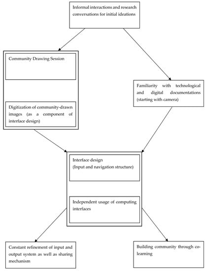 In addition to conducting 17 qualitative interviews (a mix of individual in-depth interviews, and focus group discussions), eight co-creative sessions were organized, where the villagers dialogically contributed in co-designing the interface and the documentation processes (ref. Figure 1). Since many of the participants were not familiar with the computing environment (e.g., smart phone, computer, Internet etc.), a co-designing-based approach to innovation was adopted. In doing so, a two-prong process was followed—(i) embracing a visual/sensory route, for example to a create culturally meaningful image, and (ii) co-developing a documentation approach without solely depending on text/textual means.