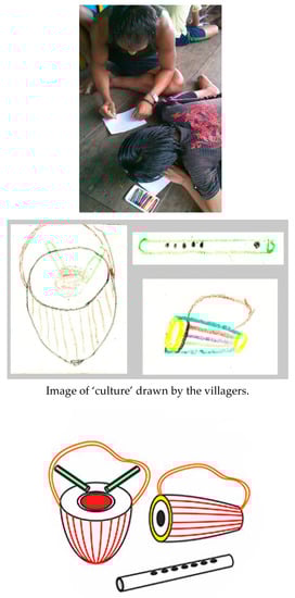 In generating cultural imageries, villagers created two types of images—first, hand-drawn images, and later they took digital photographs using the cameras that they were provided as a part of the research. In the hand-drawn image creation process, the junior members of the community oftentimes assisted the senior villagers. For conducting the drawing sessions, paper and writing materials were supplied. The villagers were requested to draw images on the topics of local importance, social processes, including abstract concepts like ‘culture’. After gathering 6–10 images on each topic, the villagers as a collective chose their preferred visual representations. In one such session, Bhola, a middle-aged indigenous participant, was interacting with me,