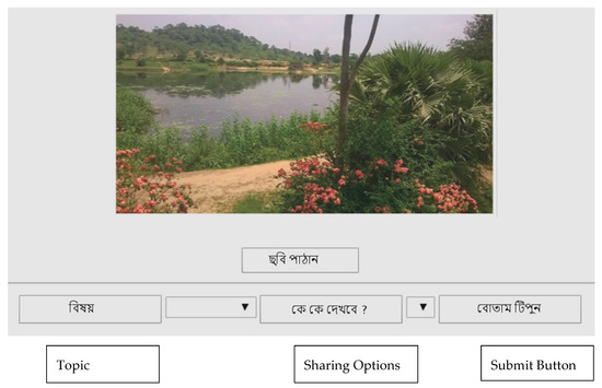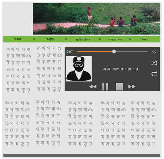 In order to facilitate digital storytelling through overcoming cultural and communicative barriers, this study situated co-designing at the heart of the research initiative. Moreover, to address and overcome technology barriers, including low-speed Internet connections and lack (or absence) computing skills among the users, the majority of the research was conducted in-situ. In the process of co-designing, active participation of the community members in every step of this research was ensured to address and incorporate the cultural aspirations, values, and practices. Starting from organically generating visual images to co-constructing contextually meaningful interfaces, the villagers participated in collectively designing and deciding sangraksha’s navigational strategies as well as determining data input/output mechanisms. As many of the community members were not conversant with digital environments, they were involved in the research process in stages—i.e., they initially produced images on paper, then they used a camera for taking photographs and videos, and at the end, digital tablets were utilized to document historical and cultural narratives. Other key challenges were villagers’ unfamiliarity with the English language as well as limited proficiency in local mainstream languages; to make the research inclusive, visual and sensory elements (instead of texts-only) were emphasized while designing the digital interfaces. Again, throughout the research, villagers’ feedback was sought and duly incorporated on a constant and consistent basis in making the process culturally-meaningful. As a part of the co-designing process, co-learning was strongly encouraged in this research to ensure ownership and control of community members in creating and sharing cultural history in the digital spaces. Moreover, (i) recruitment of community members, and seeking their inputs in every stage of co-development of ‘sangraksha’ as well as (ii) their participation in facilitating dialogue, and seeking users’ feedback in community settings made the process bottom-up and organic.