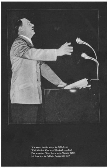 Read on its own, then, this poem could be seen as an exploration of an imaginative, dreamy state of mind (à la Romanticism) or a distortion of sensual reality in the interest of blurring the boundary between (rational) life and (the irrationality of) art, after the kinds of modernist practices (of Symbolists, Surrealists, etc.) that dominated much of Brecht’s poetic milieu. But Brecht does not leave the poem on its own, in a state of vagueness and openness to a multiplicity of interpretations, as much postmodernist poetry would later aspire to do. Instead, he provides us a with a concrete, irrefutable, and absolutely visible referent: a photograph of Adolf Hitler.