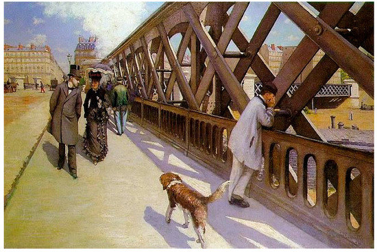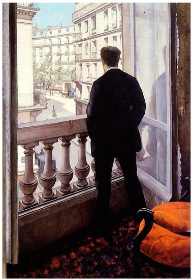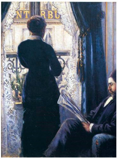 Forgione 2005). Being a native of Paris, Des Esseintes would have likely agreed with the above statement, and would have used similar reasoning in order to justify his intent to shun society in the attempt to “cultivate his inner self” and soothe his nerves. But perhaps a similar philosophy is at stake in the interior paintings of Caillebotte. After all, from his windows, we can see the modern Haussmanization of Paris. Sometimes we get sparsely-populated streets that represent the widening of the boulevards consistent with the Haussmannian vision, but we also occasionally get crowded streets and squares where one might indeed consider the overcrowding of these spaces as “invasive to the psyche and abrasive to the sense of self.”
