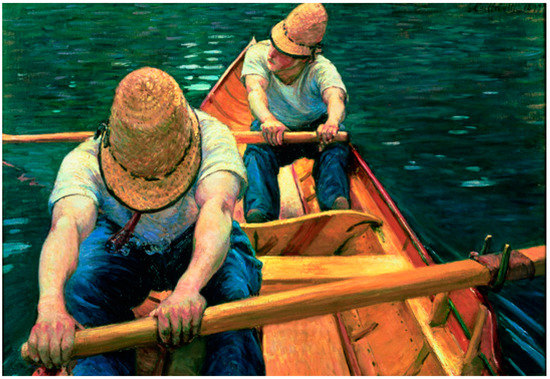 Marrinan 2002). The shirtless men work through the monotonous strain of the physical labor involved in scraping the floor, as their anatomical representation echoes that of the rowers in Caillebotte’s