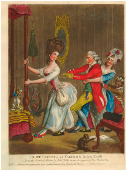 Jon Collet, Tight Lacing, or Fashion before Ease (1777). Paper. Satirical print published by Bowles and Carver. The British Museum. Source: https://www.britishmuseum.org/research/collection_online/collection_object_details/collection_image_gallery.aspx?assetId=142571001&objectId=1639535&partId=1.