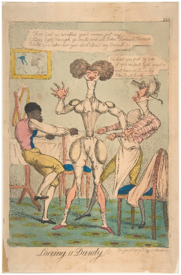 Anonymous, Lacing a Dandy (1819). Hand-colored etching. Satirical print published by Thomas Tegg. The Metropolitan Museum of Art. Source: https://www.metmuseum.org/art/collection/search/384283.