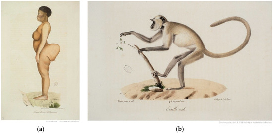 Wermer, illustrations for Histoire Naturelle des Mammifères (1819). (a) Depiction of Baartman with the caption “Femme de race Bôchismanne”. (b) Depiction of a male monkey with the caption “Entelle mâle”. Text Etienne Geoffroy Saint–Hilaire and Frédéric Cuvier. Bibliothèque National de France (Gallica.bnf.fr). Source: https://gallica.bnf.fr/ark:/12148/btv1b2300295r?rk=107296;4.