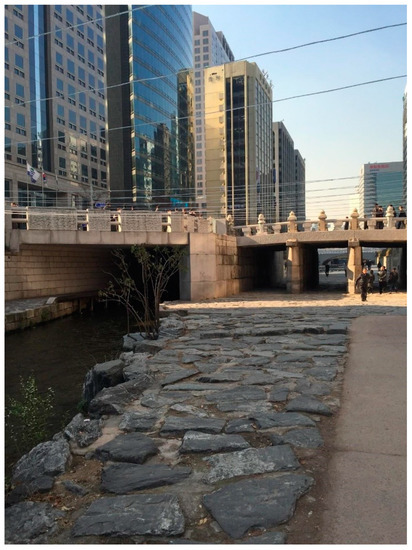 Figure 7), and emerge on the other side, the water edge takes on a softer edge and a naturalistic appearance through the addition of naturalistic stones and small touches of vegetation. The discovery of the buried Gwangtonggyo during project planning in 2003 provided popular support for the stream restoration and as Hong Kal described, its “discovery gave life to the stream and brought back the past needed for the national imagination” (