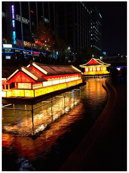 Lynch 1972, pp. 36–37), Lynch argues that having editorial control over the past allows for moving forward, especially in response to a history that is marked by strife and struggle. A major example of this selective editing of history in the Cheonggyecheon’s historical narrative is the glaring omission of the Japanese colonial period. The deliberate erasure of this significant timeframe from the design illustrates the project’s nationalist assertion by removing the period from the broad timeline of historic markers. Yet, the prominent inclusion of the Japanese lantern installation during the Lantern Festival is indicative of the city’s focus on promoting globalization and cultivating a cosmopolitan image and outlook. The Cheonggyecheon reflects divergent and imaginative representations of history and memory. The chosen representations ultimately give the project a sense of history from which the city has moved past the memories of hardships and struggle. In this sense, the project reflects Halbwachs’ assertion of the incompleteness of a historical project when he writes that “history is neither the whole nor even all that remains of the past” (