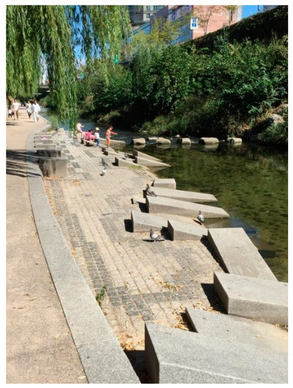 Figure 16). The proximity of the water here allows small children to dip their hands into the water, making it one of the areas that is popular for families to stop and play. The abstract design of the concrete laundry slabs gives the area a distinctive appearance from the rest of the water edge of the park, and more than evoking images of a laundry space, they give the space a playful edge that allows the water to merge and intersect more with the promenade. Apart from these few discreet displays, the majority of the spaces in the second section is full of lush vegetation, and there are certain areas where the walking path is only on one side of the stream, allowing for the greenery to dominate one half of the space. Thus, whereas the first section of the Cheonggyecheon varies the attention and focus between the art and displays with the flora, the second section puts more emphasis on the riparian landscape and stream for the most part, and the displays alluding to the past are either not noticeable, or made to not take attention away from the natural elements.