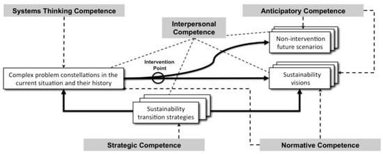 “The five key competencies in sustainability (shaded in grey) as they are linked to a sustainability research and problem-solving framework […]. The dashed arrows indicate the relevance of individual competencies for one or more components of the research and problem-solving framework […]” (Wiek et al. 2011, p. 206).