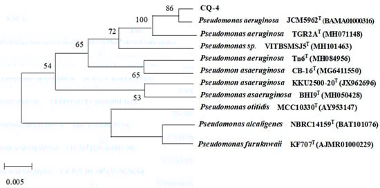The 16S rDNA sequence analysis results show that the 16S rDNA sequence is approximately 1441 bp in length, and CQ-4 is closely related to Pseudomonas aeruginosa JCM 5962T (BAMA01000316) (Figure 3). Combining morphological observation, identifying physical and chemical characteristics and 16S rDNA gene sequence analysis, the strain CQ-4 was identified as Pseudomonas aeruginosa.