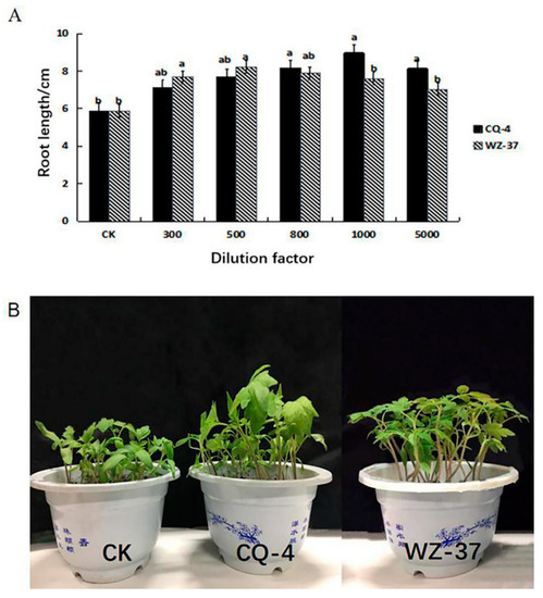 The biocontrol bacteria CQ-4 has a growth-promoting effect on tomatoes. The experimental results show that, when CQ-4 suspension was diluted between103 times (spore concentration 1.0 × 108 cfu mL−1) and 104 times (spore concentration 1.0 × 107 cfu mL−1), it had a better growth-promoting effect on tomato seeds (Supplementary Figure S1). Diluting the bacterial suspension of the biocontrol bacteria CQ-4 by 500 times (spore concentration 2.0 × 108 cfu mL−1), 800 times (spore concentration 1.25 × 107 cfu mL−1), and 1000 times (spore concentration 1 × 108 cfu mL−1) promoted the growth of tomato seedlings. The highest radicle length of the CQ-4 treatment group was 1.52 times that of the CK (ddH2O treatment as mock) group, and the lowest was 1.30 times. The growth promotion effect was the highest when the spore concentration of strain CQ-4 was 1.0 × 108 cfu mL−1 (Figure 5A).