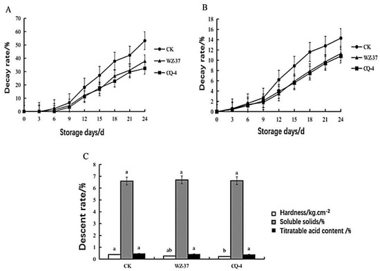 Subsequently, we test the hardness, titratable acid, and soluble solid content of tomato fruits after storage. The results showed that, after 24 days of storage, the hardness of the biocontrol strains CQ-4, WZ-37 (A Biocontrol Bacterial Strain stored in the laboratory was used as the control) and CK group decreased by 38.3%, 25.4%, and 21.8%, respectively. Simultaneously, no significant differences were observed in the soluble solids and titratable acid content of each treatment group. The result indicates that the strain CQ-4 has no obvious adverse effect on the nutritional components of tomato fruits (Figure 6C).