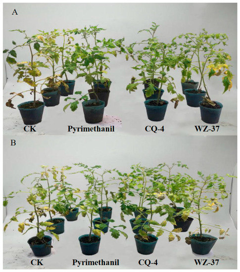 The control effect test of detached leaves: sterilized tomato leaves were placed in a soaked two-layer sterile filter paper petri dish. Cotton wool was dipped in the same concentration (1.0 × 108 cfu mL−1) of CQ-4, WZ-37 bacterial suspension and then smeared evenly on the leaves, 40% pyrimethanil was used as a positive control, sterile water as a blank control, and then dried. Botrytis cinerea was inoculated, cultured at a constant temperature of 25 °C, and observed daily in order to calculate the incidence of detached leaves, disease index, and control effect. Fifteen leaves were used for each treatment and then repeated three times.