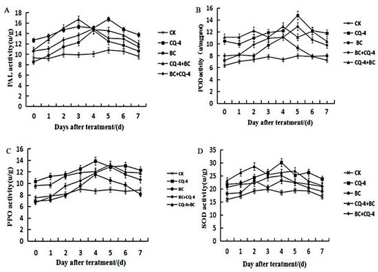 The POD activity of tomato leaves treated with CQ-4 was significantly increased in the absence of Botrytis cinerae, and it reached its peak on the fifth day. The POD activity of tomato leaves that were treated with CQ-4 was 46.05% higher than CK group. Subsequently, it decreased slowly, but it was still higher than the CK group (Figure 9B).