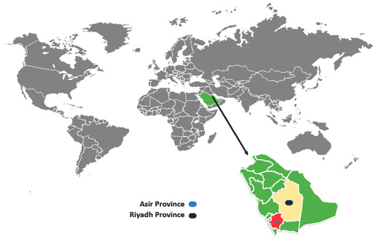 The investigation was conducted from November 2018 to August 2019 in the Asir (19.0969° N, 42.8638° E) and Riyadh (24.7136° N, 46.6753° E) Provinces, located in southwestern and central Saudi Arabia, respectively (Figure 1). The Asir Province borders the Red Sea and Yemen, has an area of 76,690 km2, and is situated on a high plateau that receives more rainfall than the rest of the country and contains the country’s highest peaks, which rise to almost 3000 m above sea level. According to the Köppen-Geiger climate classification, this province has different climates, but the most prevalent ones are BWh (hot desert climates) and BSk (cold semi-arid climates). The average annual rainfall in the highlands ranges from 300 to 500 mm across two rainy seasons. As a result, there is much more natural vegetation and forests. Riyadh region’s climate, however, is BWh with virtually no rainfall during the year (http://www.pme.gov.sa).