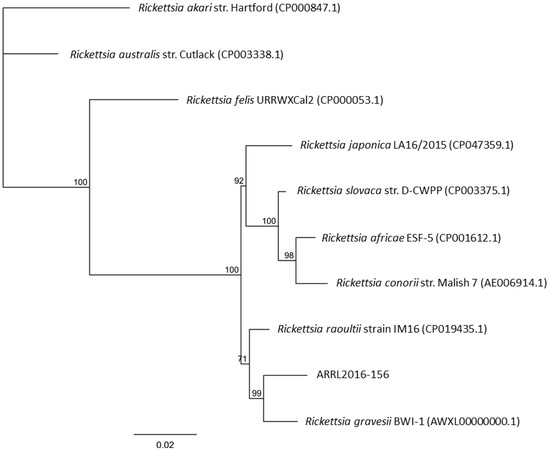 Rickettsia ompA gene sequence phylogenetic tree. The phylogenetic relationship between the newly detected Rickettsia spp. (ARRL2016-156) to other closely related rickettsiae was determined by comparing partial ompA gene sequences. Branch lengths indicate the number of substitutions per site. The percentage of trees in which the associated taxa clustered together is shown next to the branches after 100 bootstrap replications.